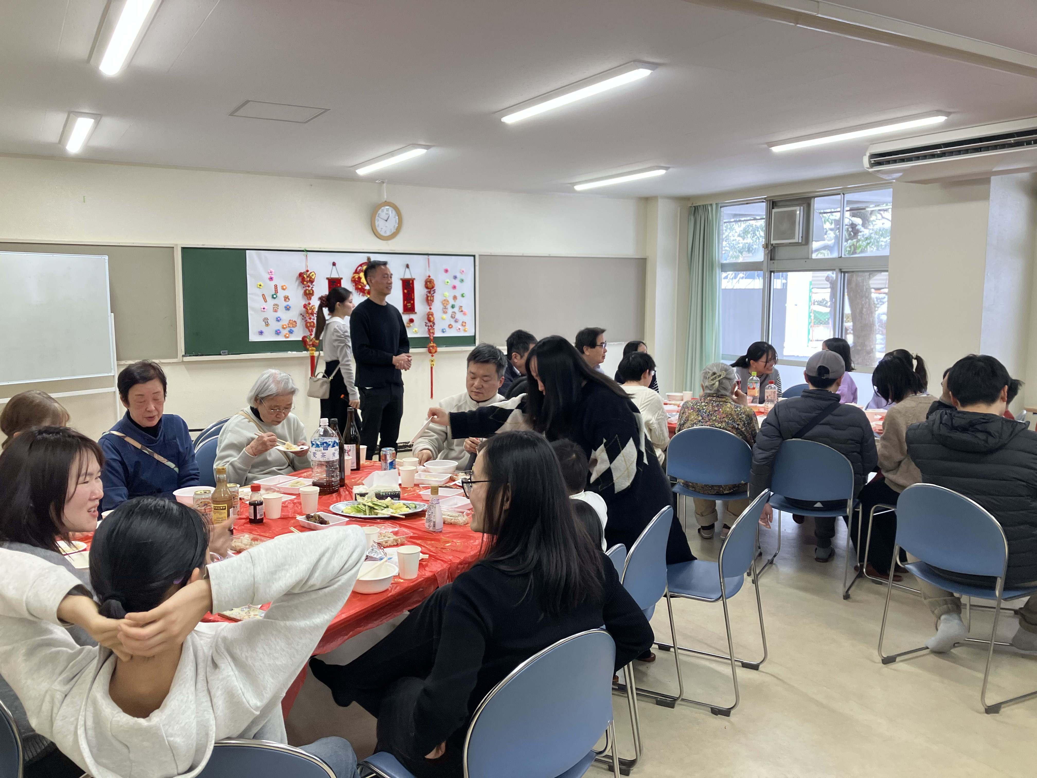 2月8日(日)の12時から2026高島平春節を開催しました。この日は突然の衆議院解散による選挙の投票日になってしまいました。加えて朝から雪が降り5センチほど積もりました。それでも準備するスタッフたちは雪にも負けず、早朝から手作り餃子や炊き込みご飯などを用意しました。胡さんが中国から持ち帰った春節の飾りを会場にはりめぐらせ、気分はほとんど春節でした。春節の最後は「朋友」、「北国の春」を全員で歌い、大盛り上がりでした。子どもたちも交えて80人近くの方が参加しました。